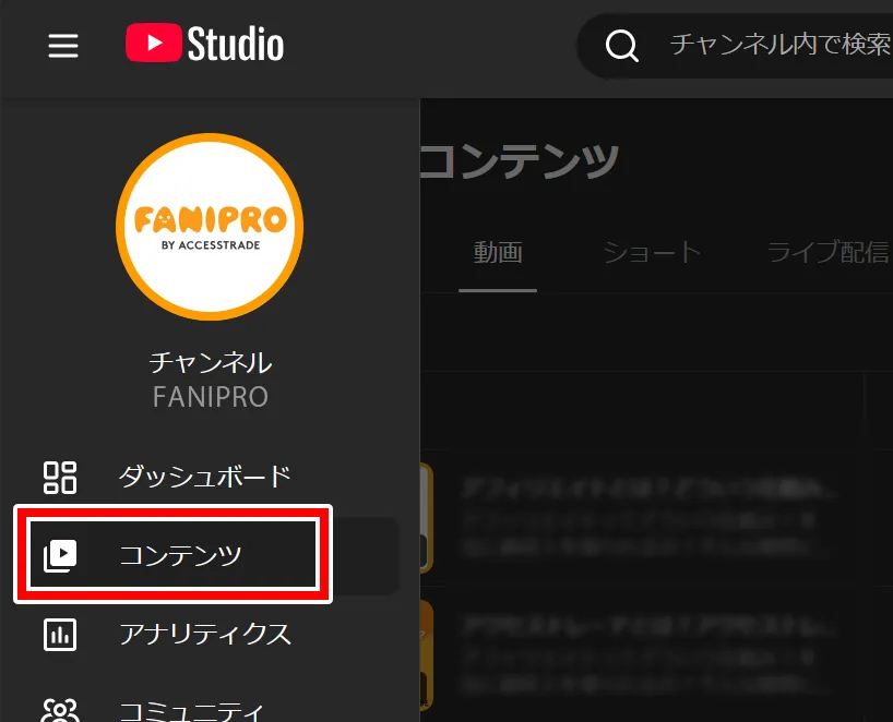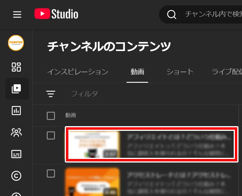 - 左メニューの「コンテンツ」から対象の動画を選択