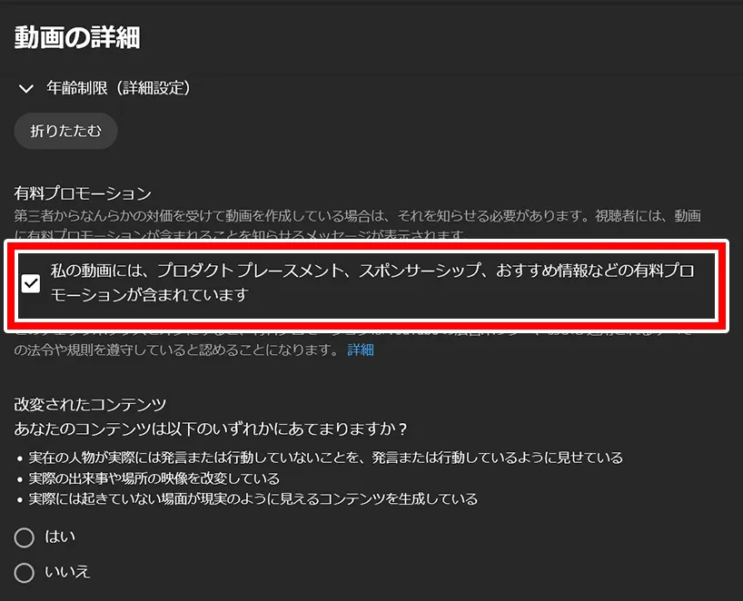 - 「私の動画には、プロダクトプレースメント、スポンサーシップ、おすすめ情報などの有料プロモーションが含まれています」にチェック