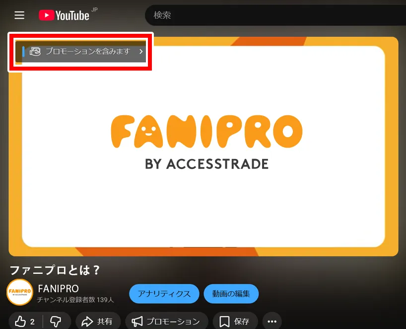 - 上記を行うと、視聴したときに「プロモーションを含みます」の表示がされます。